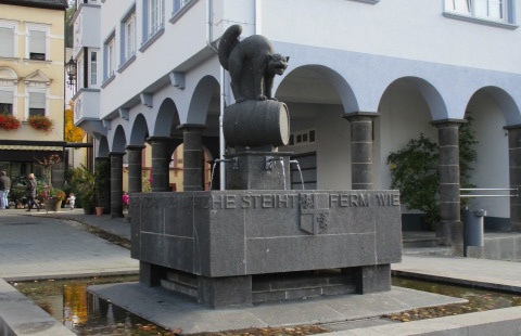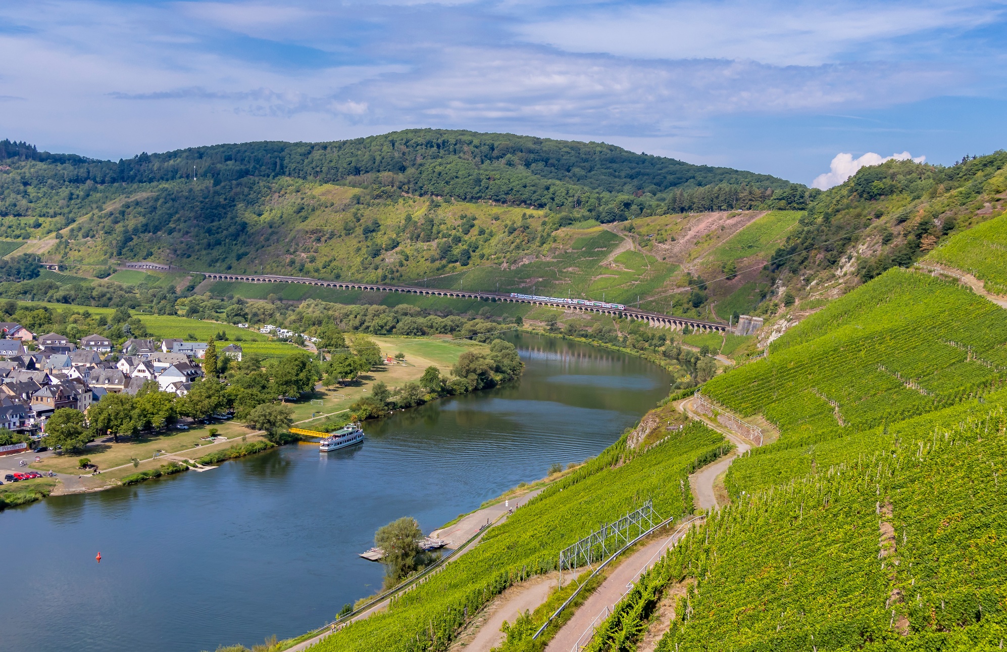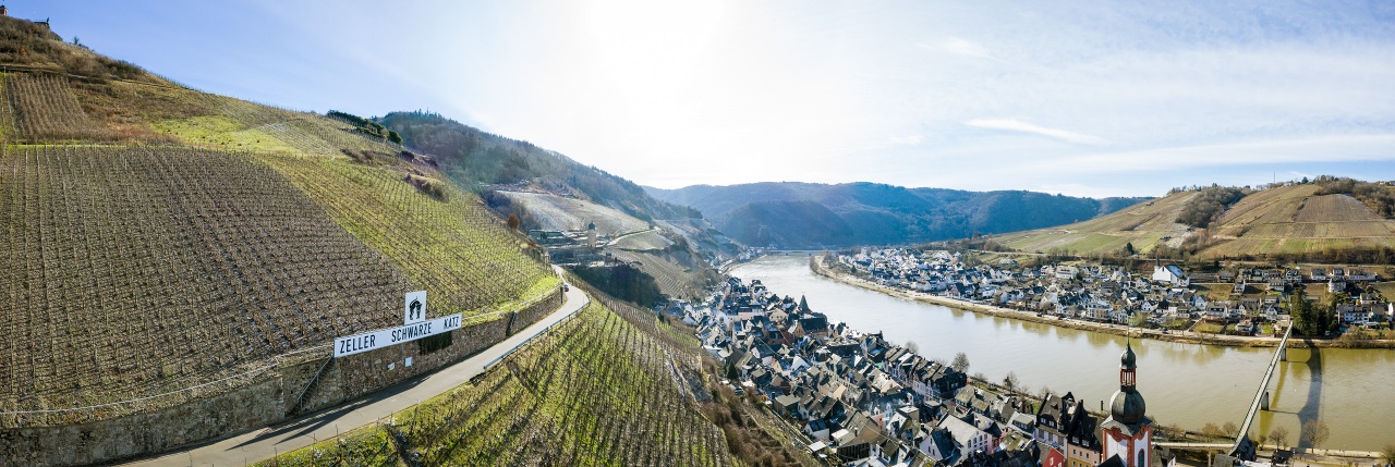 Der Moselsteig führt nun weiter durch die Weinberge, auch nachdem die Zufahrtsstraße zum Stadtteil Barl gequert ist. An einem Taleinschnitt beginnt dann der Abstieg nach Zell und zur Mosel. Über einen Pfad direkt durch den Weinberg erreichst du die B 53. Die überquerst du vorsichtig und kommst am Friedhof zum Zeller Stadtteil Kaimt. Jetzt geht es noch über mehrere Treppen weiter bergab zur Fußgängerbrücke. Über die Brücke (die einzige reine Fußgängerbrücke an der deutschen Mosel!) führt der Moselsteig nach Zell. Entlang der Uferpromenade etwas moselaufwärts erreichst du den Zeller Schwarze Katz-Brunnen und damit das Ende dieser Etappe.