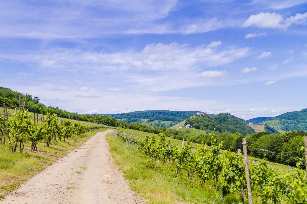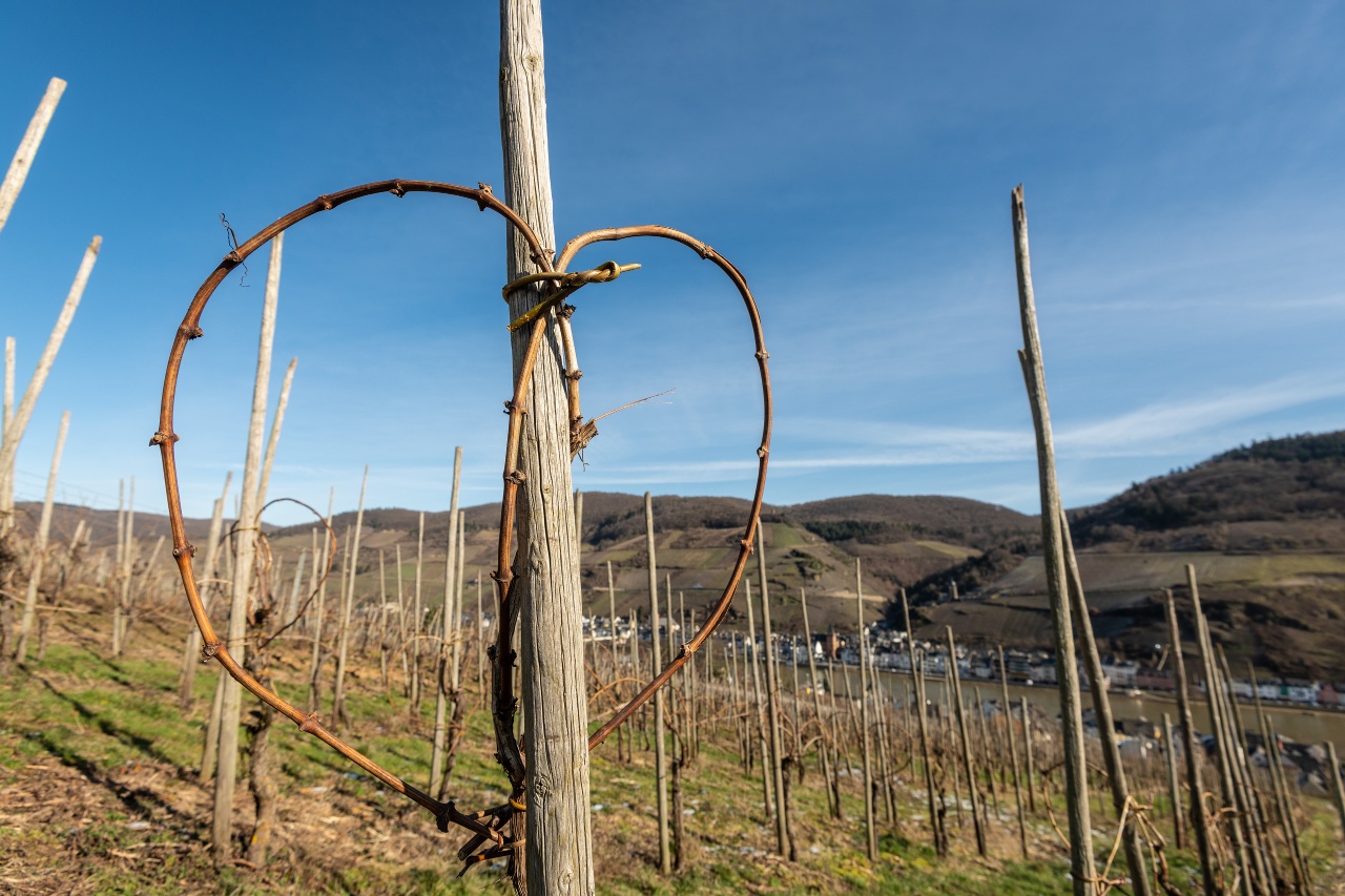Am Waldrand erwartet dich dann ein abwechslungsreicher Hangkantenweg: rechts meist von Weinbergen begleitet und steil abfallend ins Moseltal, links steht überwiegend niederer Laubwald. Die Aussicht ist durchgängig einfach herrlich! Oberhalb der Weinlage Briedeler Herzchen wird dir der Ort auf der anderen Moselseite ins Auge fallen. Du gelangst nach Briedel über einen Zuweg (Betriebszeiten der Fähre beachten), sobald sich der Weg der Mosel etwas genähert hat.