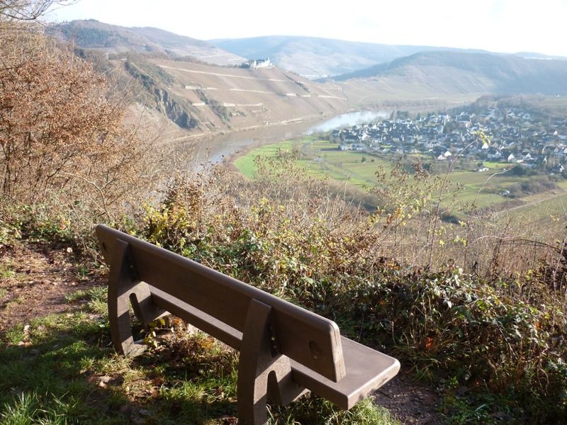 Ein aussichtsreicher Weg führt nun zur Marienburg. Hier zweigt ein Moselsteig-Zuweg ab, der als Treppenweg steil abwärts zu einer Fähre leitet. Die Fähre nimmt, wer ins gegenüber liegende Pünderich möchte, (Betriebszeiten beachten). Der Moselsteig durchquert jetzt das Gelände der Marienburg und wechselt auf einen Pfad auf der Rückseite der Anlage. Dort gibt es auch eine Abstiegsmöglichkeit nach Bullay. In Richtung Zell verläuft der Weg entlang der Zufahrtsstraße durch die Weinberge auf dem Sattel zwischen Marienburg und Barl. Dann steigt er wieder an – zunächst noch moderat, später durch ein kleines Waldstück hindurch auch richtig steil.