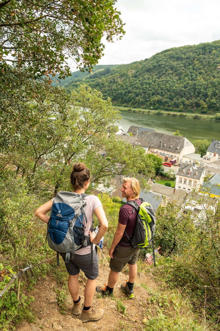 Ab hier geht es sofort wieder in das steile Gelände oberhalb des Ortes. Ein mit Seilen gesicherter Pfad leitet dich in die Weinberge und zur dort gelegenen Wetterstation. Der Weg mitten durch die mit Reben bestandenen Hänge führt dich vorbei an einem alten Wingertshäuschen zur vorgelagerten Schutzhütte. Von hier – aber auch schon auf dem Weg hierhin – bietet sich dir eine faszinierende Aussicht ins Moseltal bei Hatzenport! Besonders die Johanniskirche direkt unterhalb der Weinberge bietet ein Bild, das in Erinnerung bleibt. Nach einem Pfadabschnitt durch den niederen Wald wird es erneut aussichtsreich, und kurz darauf ist die Rabenlay erreicht. Hier erwartet dich eine Schutzhütte, ein Rastplatz und eine Liege mit Traumblick – ein idealer Ort für ein ausgiebiges Picknick!