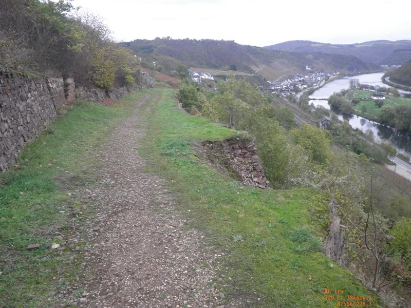 Vom Bahnhof in Moselkern startest du diese Moselsteig Etappe, indem du zunächst der Zuweg-Markierung folgst. Über den gepflasterten Weg neben den Bahngleisen geht es zur Überführung über die Bahnstrecke und dann ins Neubaugebiet. Nach den letzten Häusern folgst du ein Stück dem flachen Weg durch die Weinberge. Dann zweigt ein steiler Pfad ab, der in einigen Serpentinen den Hang durch den Wald erklimmt. Der Pfad erreicht die K 33, auf der du ein kurzes Stück bergauf wandern mußt. An einer Kapelle an der Hangkante verlässt du bald die Straße. Nun hast du den Moselsteig-Hauptweg erreicht, auf dem es jetzt weiter in Richtung Löf geht.