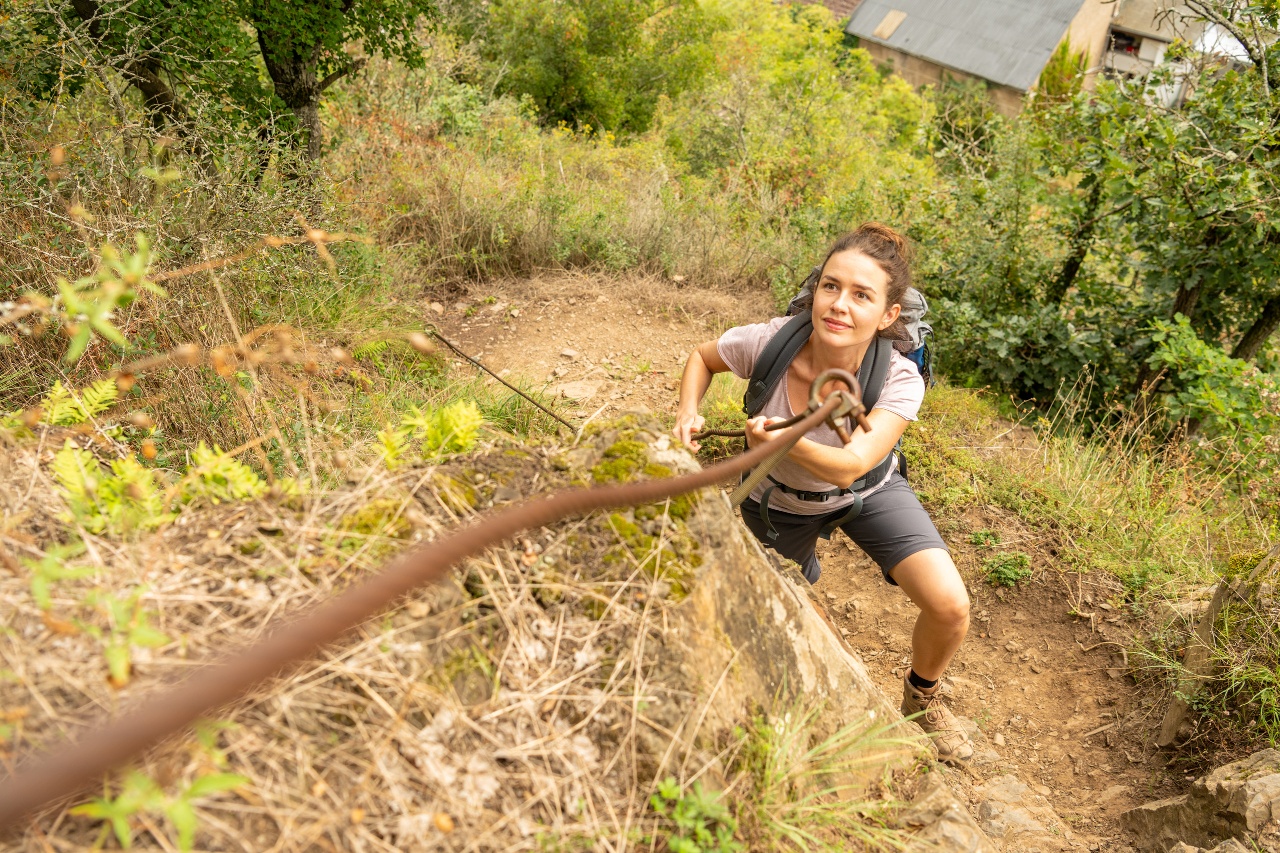 Der Moselsteig führt noch weiter entlang der Hangkante bis zum Waldrand. Ab hier verläuft der Traumpfad Hatzenporter Laysteig auf der gleichen Trasse, so geht es nun auf einem Pfad abwärts durch den niederen Wald. An einem Rastplatz mit wunderschöner Aussicht ins Moseltal endet der Pfadabschnitt. Ein Panoramaweg schließt sich an, der dich immer mit freiem Blick ins Moseltal moderat bergab durch die ehemaligen Weinberge führt. Das Neubaugebiet von Hatzenport ist schnell durchwandert. Nach Querung der L 113 triffst du auf den kurzen Klettersteig Dolling – du kannst ihn entlang der Straße umgehen. Beide Varianten treffen sich wieder an der Bahnunterführung im Schrumpftal in Hatzenport, ganz in der Nähe des Bahnhaltepunktes.