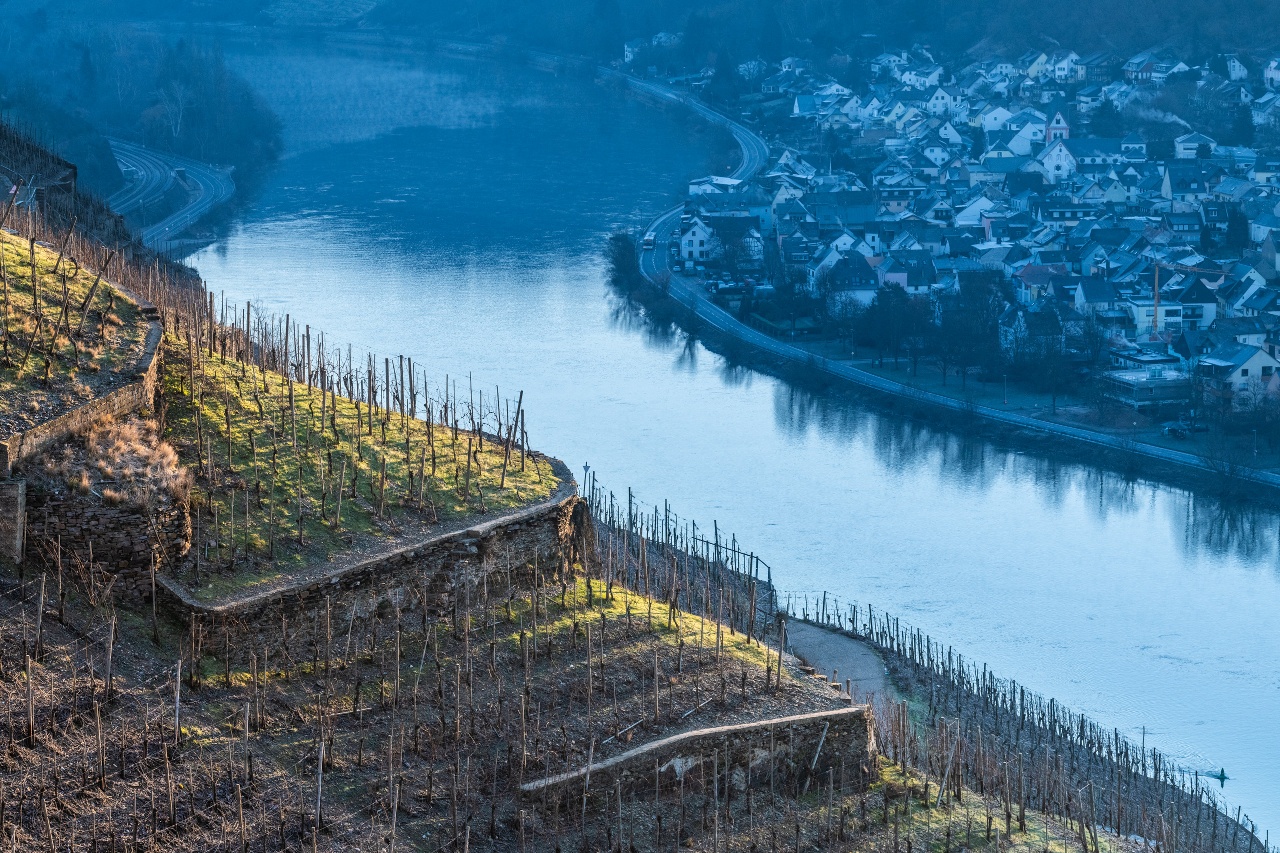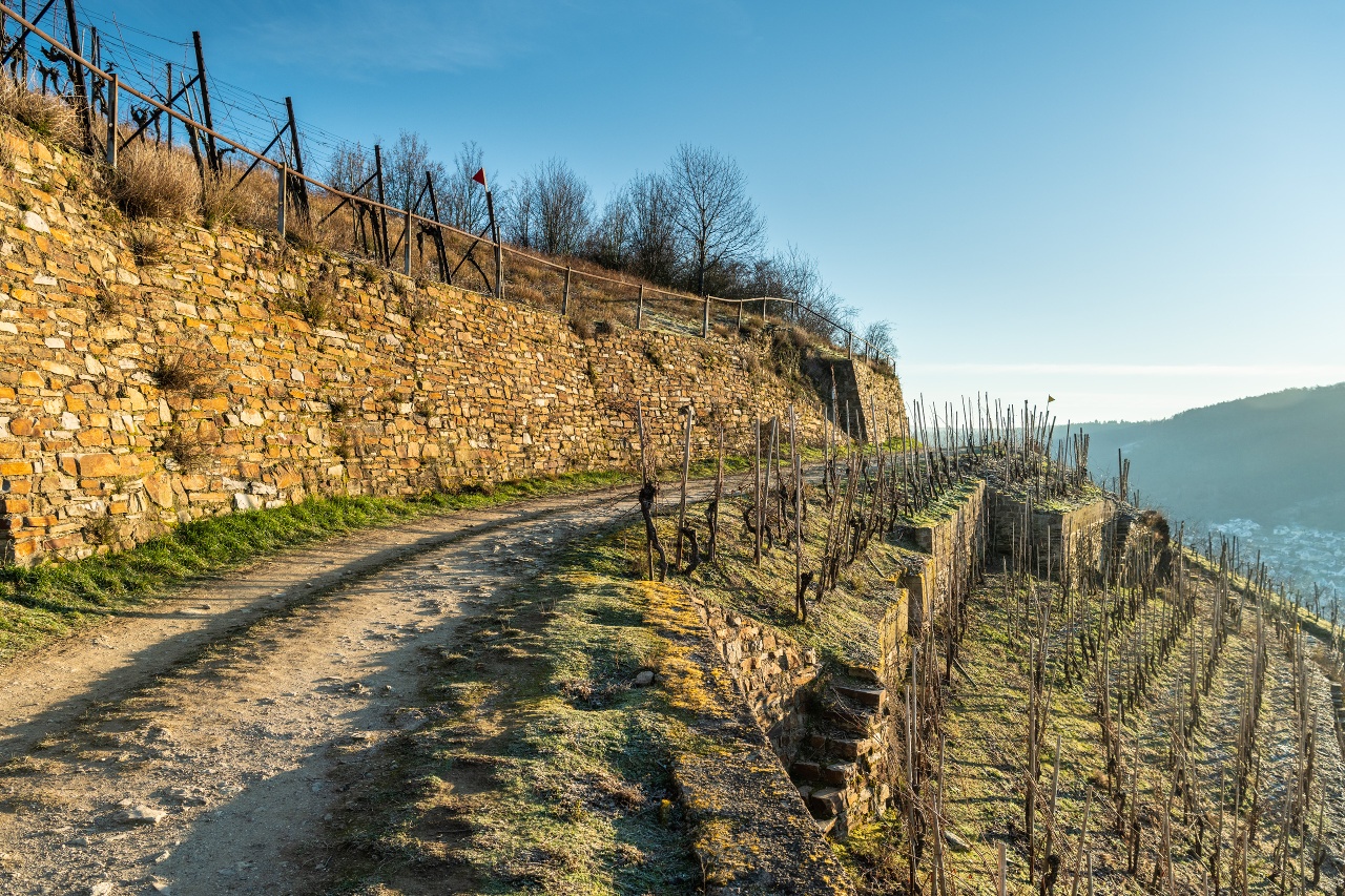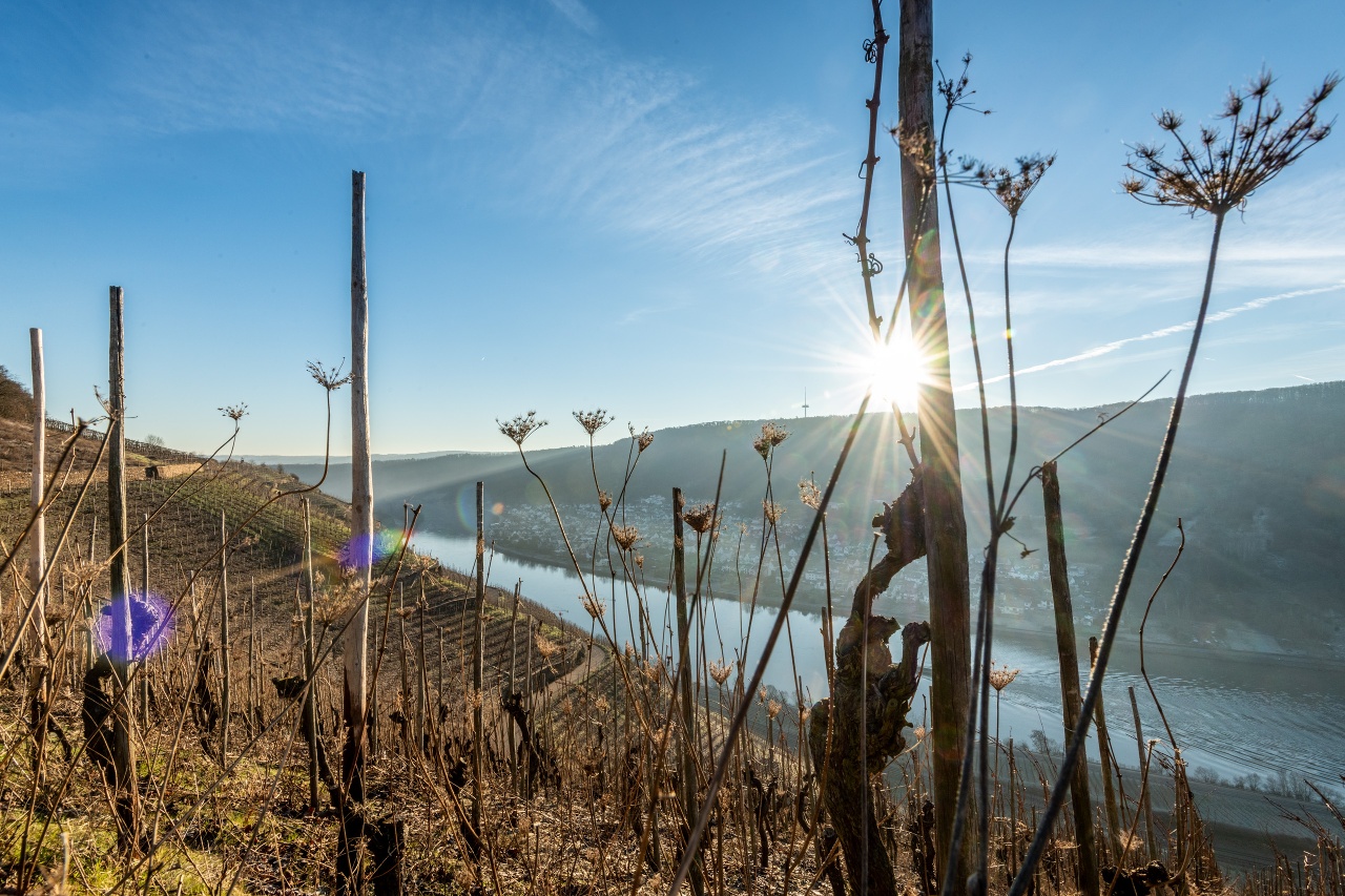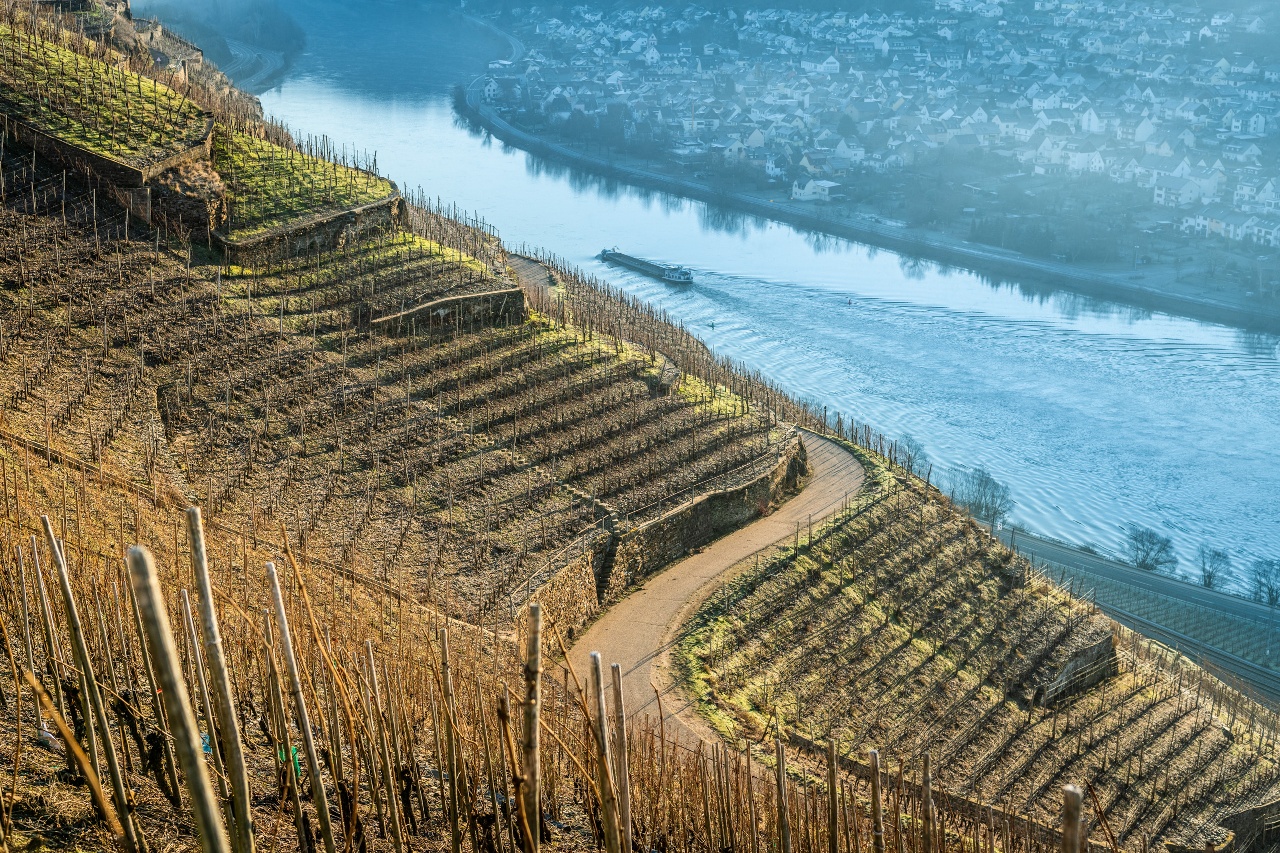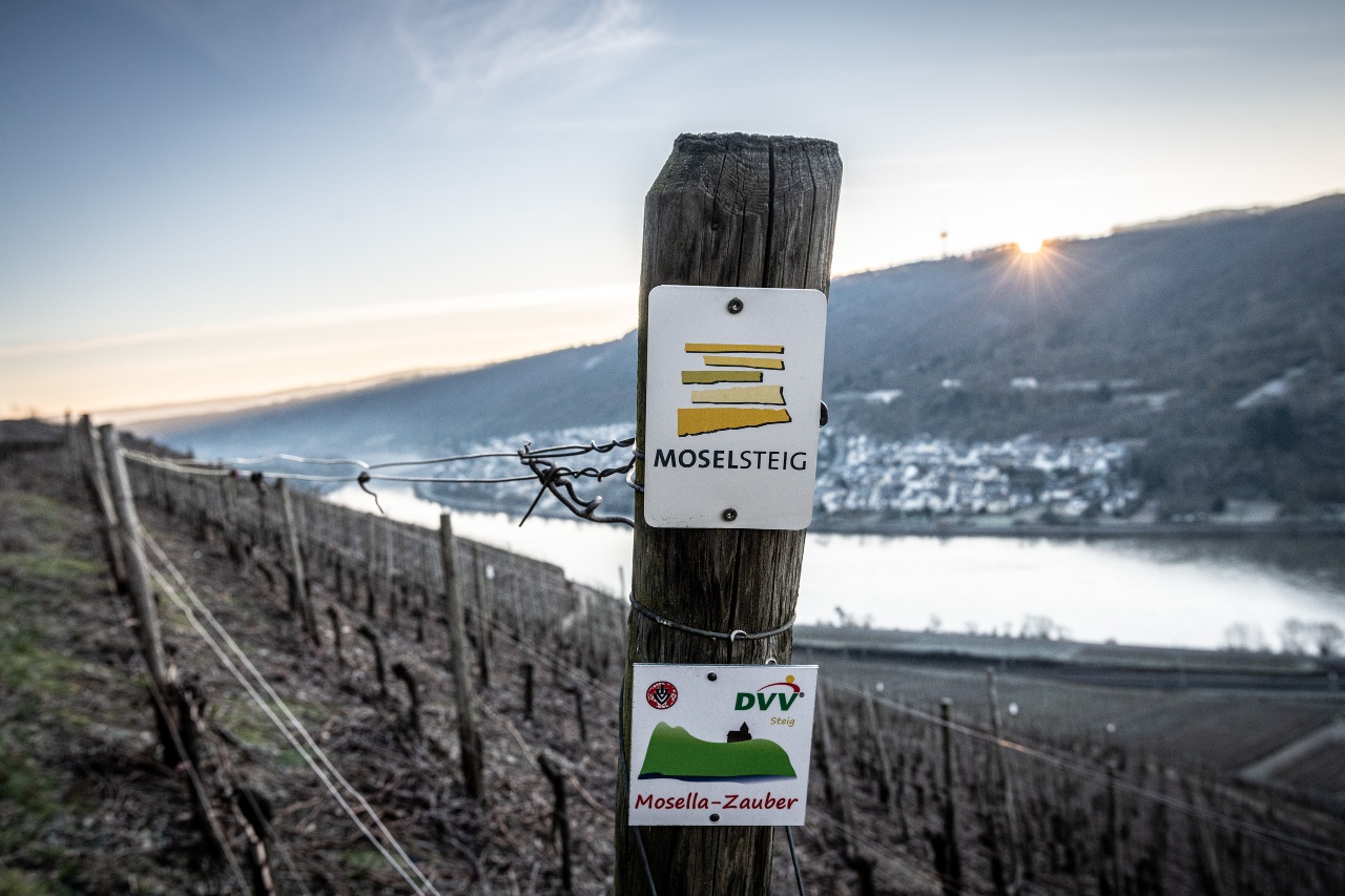 Direkt vor dem Bahnhof startest du diese Etappe, die dich zur Moselmündung am Deutschen Eck in Koblenz führt. Der Moselsteig-Zuweg verläuft zunächst durch die engen Gassen von Winningen, bevor der Anstieg durch die Weinberge beginnt. Über einen Serpentinenpfad mit schönem Blick auf das tiefer liegende Dorf gelangst du dann zur Domgartenhütte mit angenehmer Rastgelegenheit und fantastischem Blick über die Rebhänge, über Winningen und den Mosellauf!