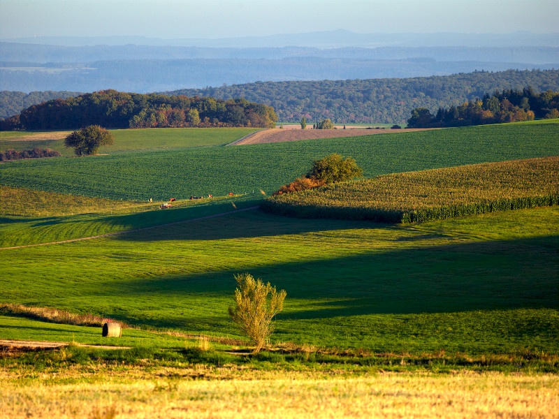 Der Moselsteig Seitensprung "Kirchspiel's Tälertour" führt zunächst ein Stück durch den Ort. Die ehemaligen Bauernhäuser sind teilweise hübsch renoviert. Vom Ortsrand steigt der Feldweg durch die offene Flur langsam an. Der Blick geht weit über die Höhen hinweg und v.a. nach Westen schaust du über Wiesen und Felder bis zu den Kuppen der Vulkaneifel am Horizont. Am Waldrand hast du die höchste Stelle der gesamten Runde erreicht. Die Bank kannst du sicher für eine kurze Verschnaufpause nutzen und nochmal den Blick zurück nach Kleinich genießen.