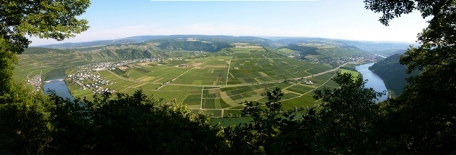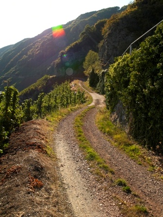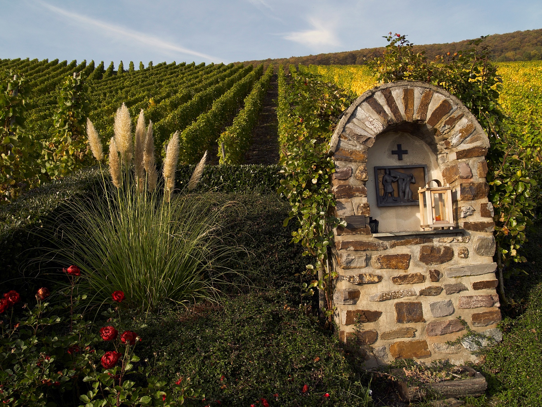In Piesport führt Sie die Landesstraße L 50 in einigen Serpentinen den Berg hinauf. Dort wo die Talhöhe erreicht wird, zweigt eine kleine Teerstraße ab. Hier am Wanderparkplatz „Piesporter Heiligenhäuschen“ beginnt und endet die Wanderung. Zunächst folgen Sie der kleinen Teerstraße ca. 150 Meter. Dann zweigt der Weg zur Grill- und Schutzhütte „Weislei“ ab, wo auch der „Große Moselblick“ ein tolles Panorama auf das Moseltal und die Höhenzüge vom Hunsrück freigibt. Sanft erstrecken sich die Weinberge auf dem gegenüberliegenden Gleithang zur Mosel. Dort führte schon vor 2000 Jahren eine römische Heerstraße zum Fluss hinab. Hingegen ragen hinter den Piesporter Häusern steile Prallhänge die Mosel empor, dicht bepflanzt mit Reben.