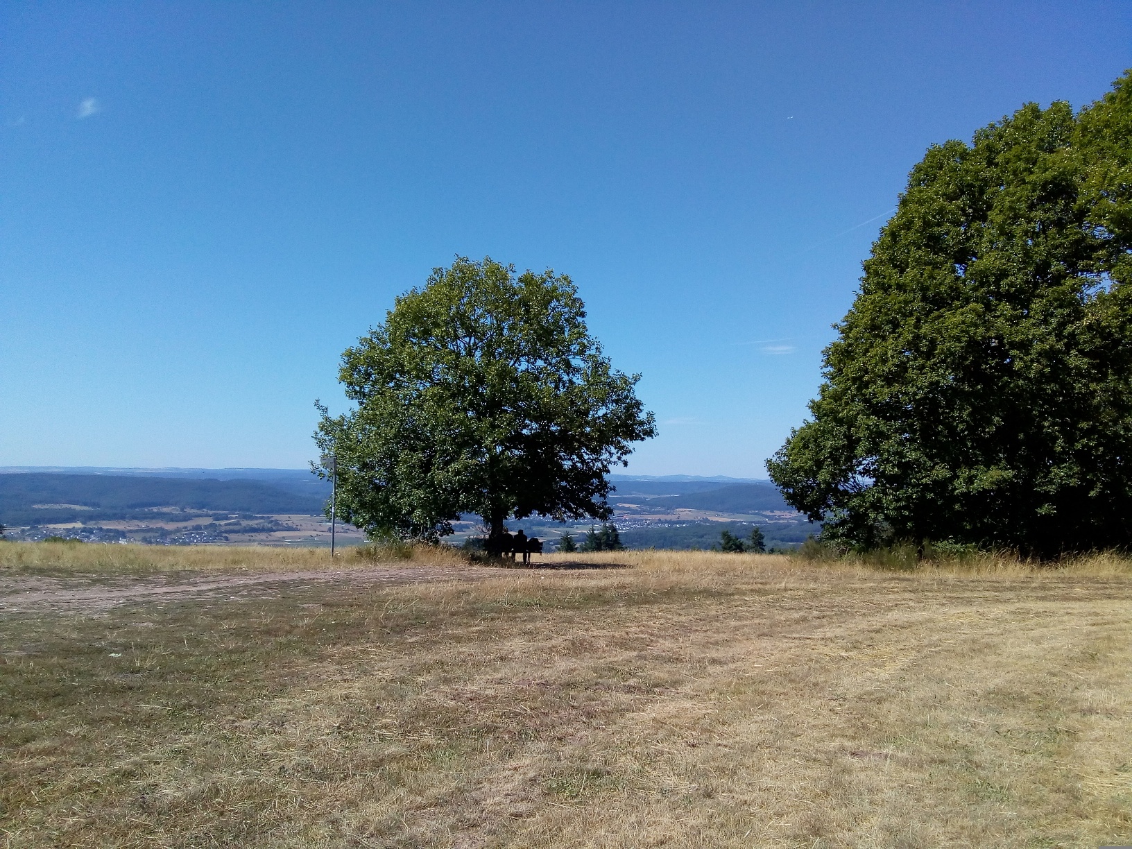 Weiter geht es durch einen Waldpfad wieder auf die Teerstraße. Nach ein paar Schritten auf Teer folgen Sie dem Abzweig an einem Birkenwäldchen (oder machen noch einen Abstecher zum Startplatz der Drachenflieger und kehren zum Abzweig zurück). Durch den Wald führt Sie der Weg dann auf offenes Wiesengelände. Erreichen Sie auf den Wiesen eine Anhöhe mit Ruhebank, sind bei guter Sicht zahlreiche Erhebungen der Eifel zu sehen. Nun führt Sie der Weg noch ein kleines Stück in Richtung des Wallfahrtsortes Klausen bevor ein Abzweig mit Wegweiser wieder den Rückweg zum Ausgangspunkt ankündigt. Dann gehen Sie überwiegend am Waldrand entlang.