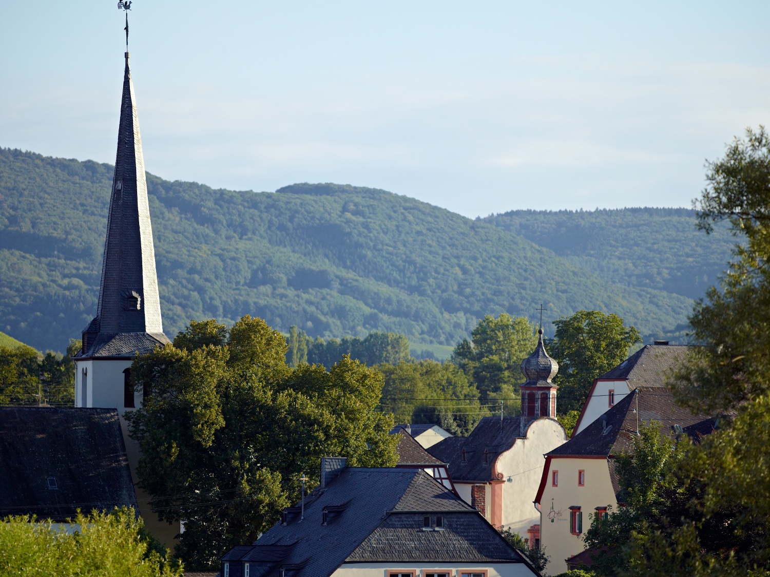 Nach einem kurzen Abstecher zu diesem Häuschen, wartet in den Serpentinen der Weinbergswege ein weiteres Highlight: Von der Weinlage „Veldenzer Kirchberg“ aus, wo der Wanderweg „Grafen, Gold und Schwarzer Peter“ kreuzt, erstreckt sich ein atemberaubender Blick über das Moseltal. Den Weinbergswegen folgend, gelangen Sie ins schöne Bachtal des Veldenzer Bachs. Der Ort Veldenz bildete unter anderem mit Mülheim und Andel die frühere Grafschaft Veldenz. Talwärts führt Sie der Weg entlang des Bachlaufs zurück zum Ausgangsort am Feuerwehrhaus. Am angrenzenden Markt- bzw. Festplatz findet jedes Jahr nach alter Tradition ein bekanntes Volksfest statt: der „Mülheimer Markt“. In der ersten Augustwoche jeden Jahres feiern Einheimische und Gäste den Markt, der bereits 500 Jahre alt ist und auf einen Markt- und Gerichtstag der Grafen von Veldenz zurückgeht. Höhepunkte dieses Festes sind die große „Grafschafter Weinprobe“, welche jedes Jahr den Startschuss liefert. Ein prächtiger Umzug bildet neben Rummel und Krammarkt einen weiteren Höhepunkt.