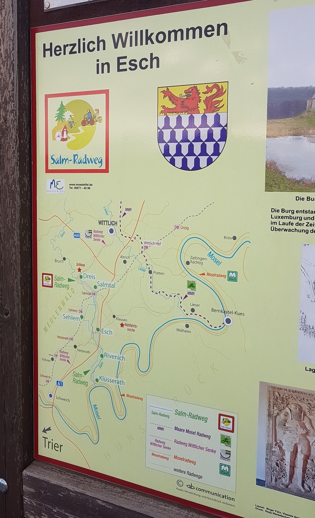 Der Radweg ist eine attraktive Verbindung durch das Wittlicher Land zwischen dem Maare-Mosel-Radweg ab Wittlich zum Mosel-Radweg nach Trier. Auf gut 30 km Länge erradelst du die leicht hügelige Landschaft der Wittlicher Senke. Die Wittlicher Senke ist die nordöstliche Fortsetzung des Trierer Tals, die nordwestlich vom Meulenwald und in südöstlicher Richtung von den Moselbergen begrenzt wird. Aufgrund dieser geschützten Lage kann hier sogar Tabak angebaut werden. Der Radweg führt dich an kleinen Ortschaften wie Hetzerath, Esch, Salmtal oder Dreis vorbei, bis du schließlich die Stadt Wittlich erreichst. Von Esch bis Dreis ist die Streckenführung identisch mit dem Salm-Radweg.