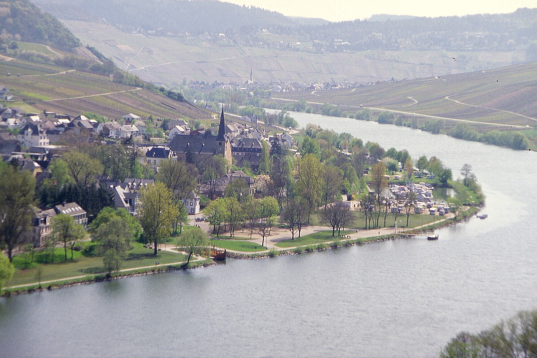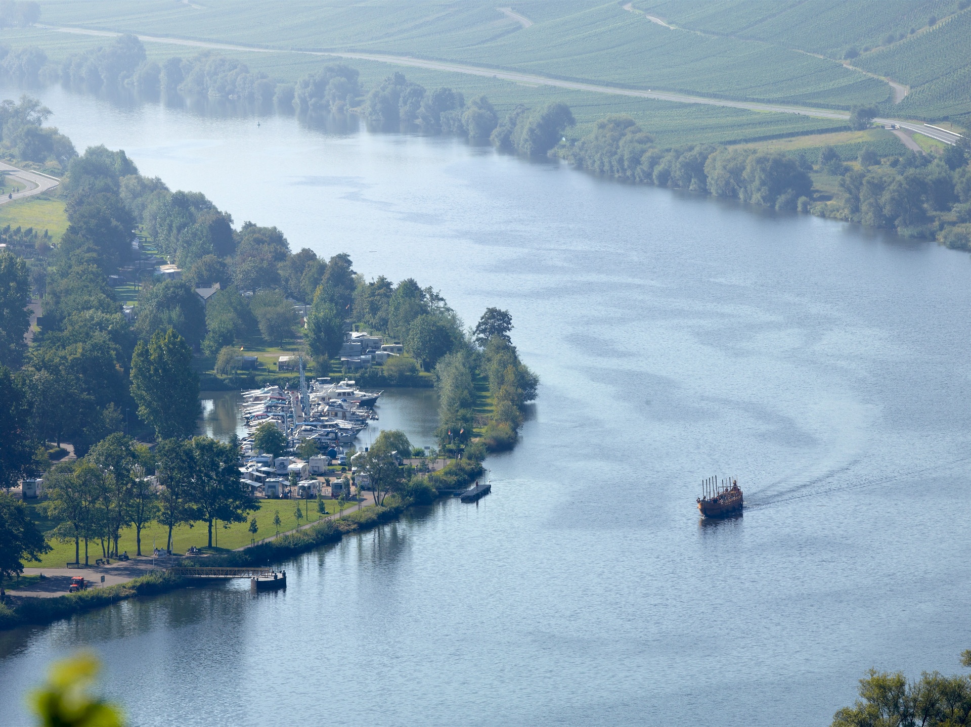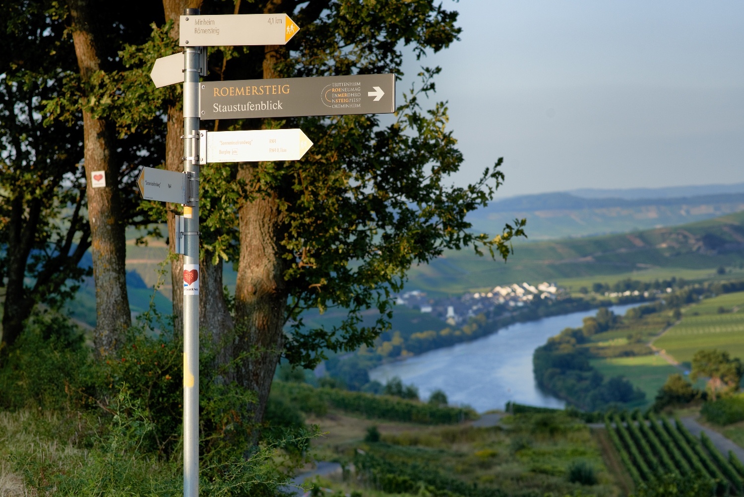 Der Wanderweg "Römersteig" startet an einem uralten Menhir, der auf der Höhe zwischen Trittenheim und Klüsserath steht. Schöne Aussichten über die Moselschleifen bieten sich beim Weg durch die Weinberge hinunter in den Weinort Trittenheim und zur Moselbrücke. Auf beiden Seiten der Brücke stehen alte Fährtürme, das einzig noch erhaltene Fährturmpaar an der Mosel. Kaum am rechten Moselufer angelangt, folgt ein anstrengender Aufstieg. Steil geht es durch die Weinlage "Trittenheimer Apotheke" und über den Fährfels. Ein kleiner Pfad durch Niederwald führt dann weiter hinauf. Oben auf einem Rastplatz angekommen ist Zeit für eine kleine Verschnaufpause. Die anschließend eher gemütliche Wegpassage führt an einem Solarpark vorbei hinab zur Märtyrerkapelle im "Neumagener Rosengärtchen", einer Weinlage von Neumagen-Dhron. In Neumagen-Dhron selbst, dem "Ältesten Weinort Deutschlands", gibt es Repliken von römischen Grabdenkmälern zu besichtigen, die in den Fundamenten eines ehemaligen Römerkastells verbaut waren. Das bekannteste Grabmonument ist das Weinschiff-Denkmal in der Römerstraße. Das Denkmal wurde Vorbild für eine besondere Attraktion der Mosel: die "Stella Noviomagi". Der "Stern von Neumagen" - so heißt das Schiff - ist mit einer Länge von fast 18 Metern, einer Breite von rund vier Metern, ca. 70 Zentimetern Tiefgang und einem Leergewicht von ca. 14 Tonnen das größte, im deutschen Sprachraum nachgebaute, schwimmfähige römische Schiff. An Wochenenden im Sommerhalbjahr lädt es zu Ausflügen auf der Mosel ein. Vereine oder Gruppen können es auch komplett chartern. Erneut wechselt man in Neumagen-Dhron die Moselseite. Zunächst folgt man dem Radweg weiter in Richtung Piesport. Ein paar hundert Meter vor Ferres, einer kleinen zu Piesport gehörenden Siedlung am Moselufer, führt eine steile alte Wingertstreppe den Hang empor. Die ausgetretenen Stufen steigt man zum nächsten Weinbergsweg hinauf, folgt diesem Weg einige Schritte und erklimmt erneut ein paar Stufen und einen kleinen Weinberg. Dann erreicht man einen weiteren, höher gelegenen, unbefestigten Wirtschaftsweg unterhalb des Hangwaldes. Dieser führt parallel zum Hang immer weiter durch die Weinberge. Erst wenn sich die Dächer von Piesport nähern, steigt man wieder zum Moselufer hinab und besichtigt dabei die Rekonstruktion der römischen Kelteranlage von Piesport, die aus dem 4. Jh. n. Chr. datiert. Am Moselufer entlang führt der Weg dann an der Kirche St. Michael und den einladenen Häusern von Alt-Piesport vorbei. Dann erfolgt erneut ein Aufstieg über die Serpentinen eines Weinbergsweges hinauf zur Panoramastraße und zur Moseloreley. Bei der Minheimer Pestkapelle steigt man wiederum zum Moselufer hinab und weiter in das Weindorf Minheim.