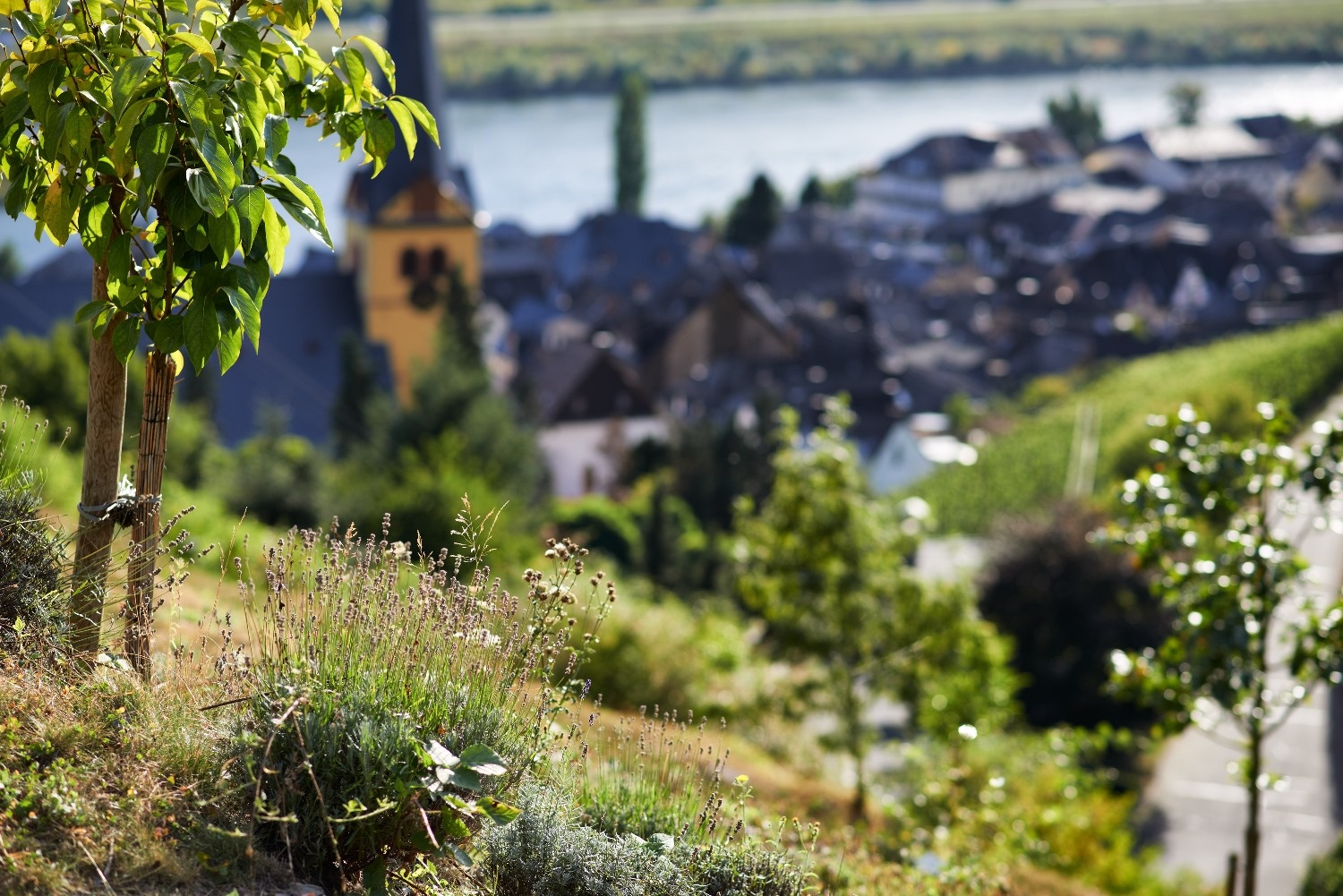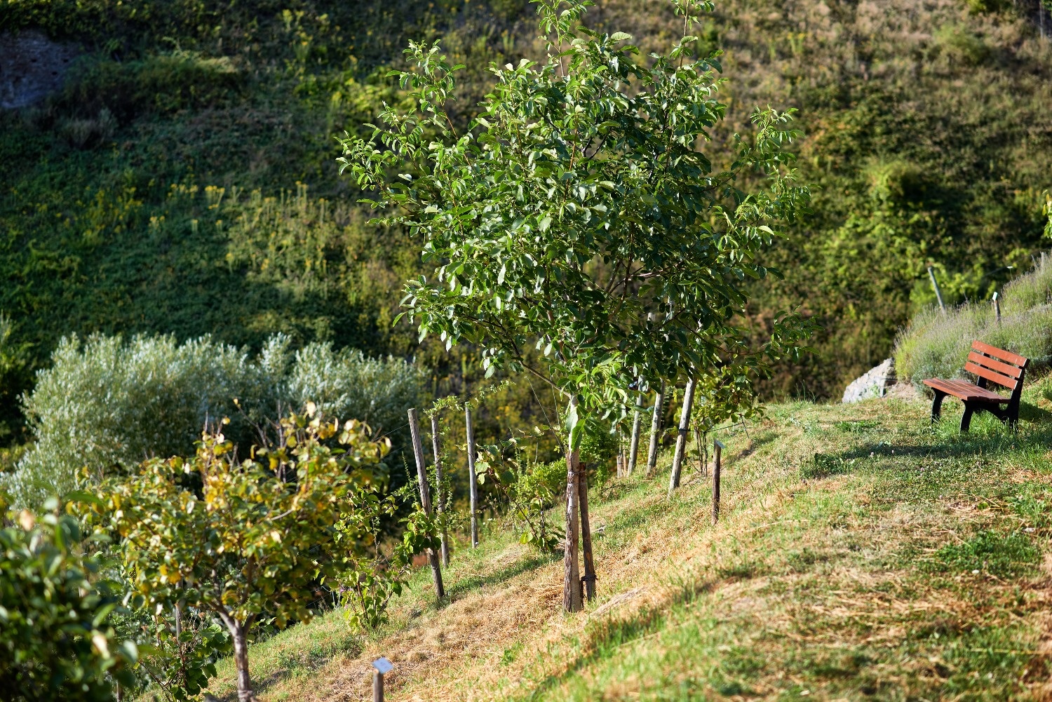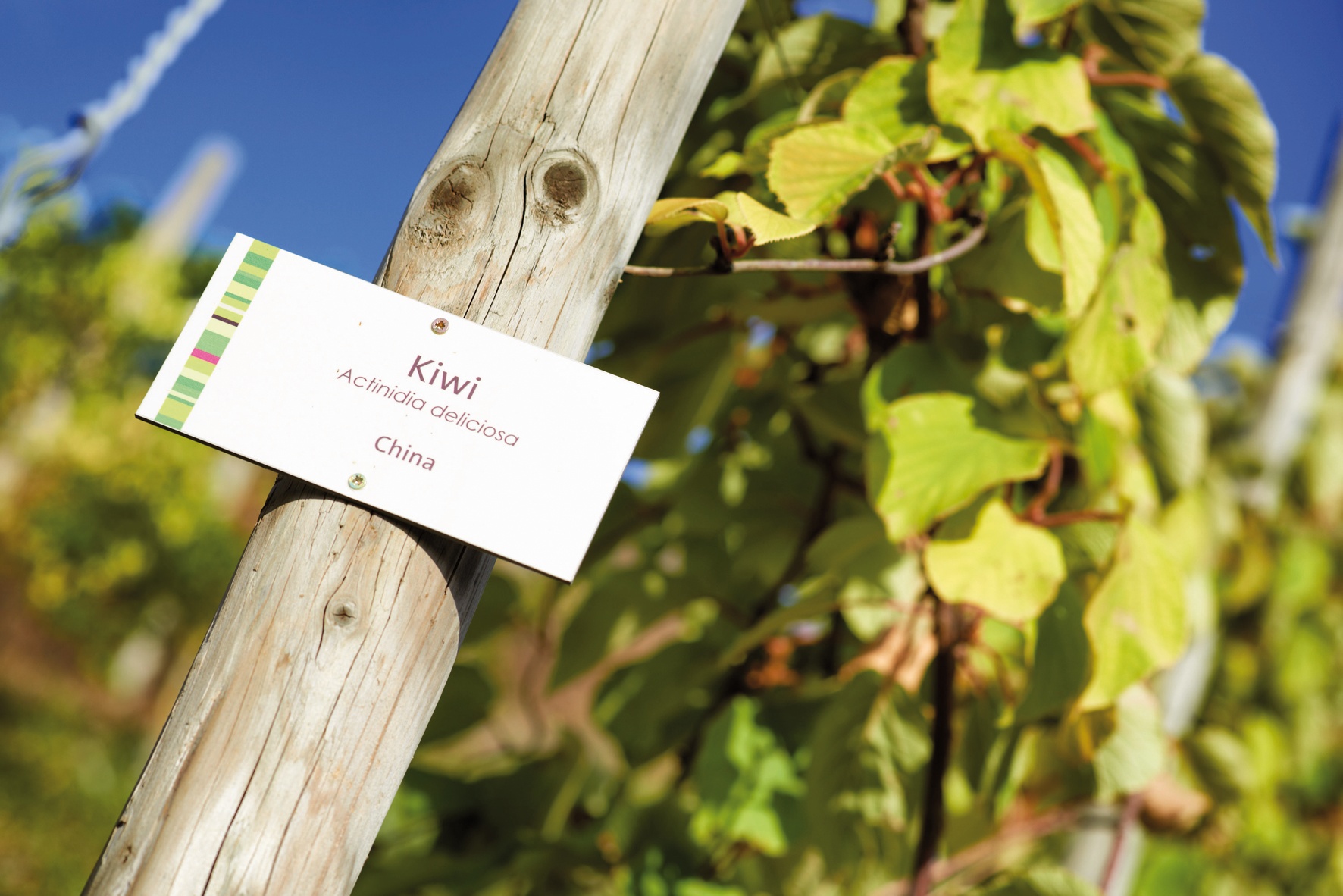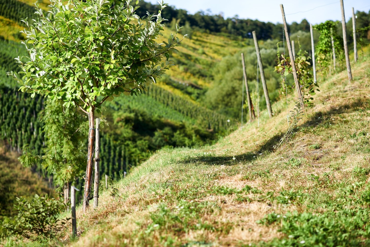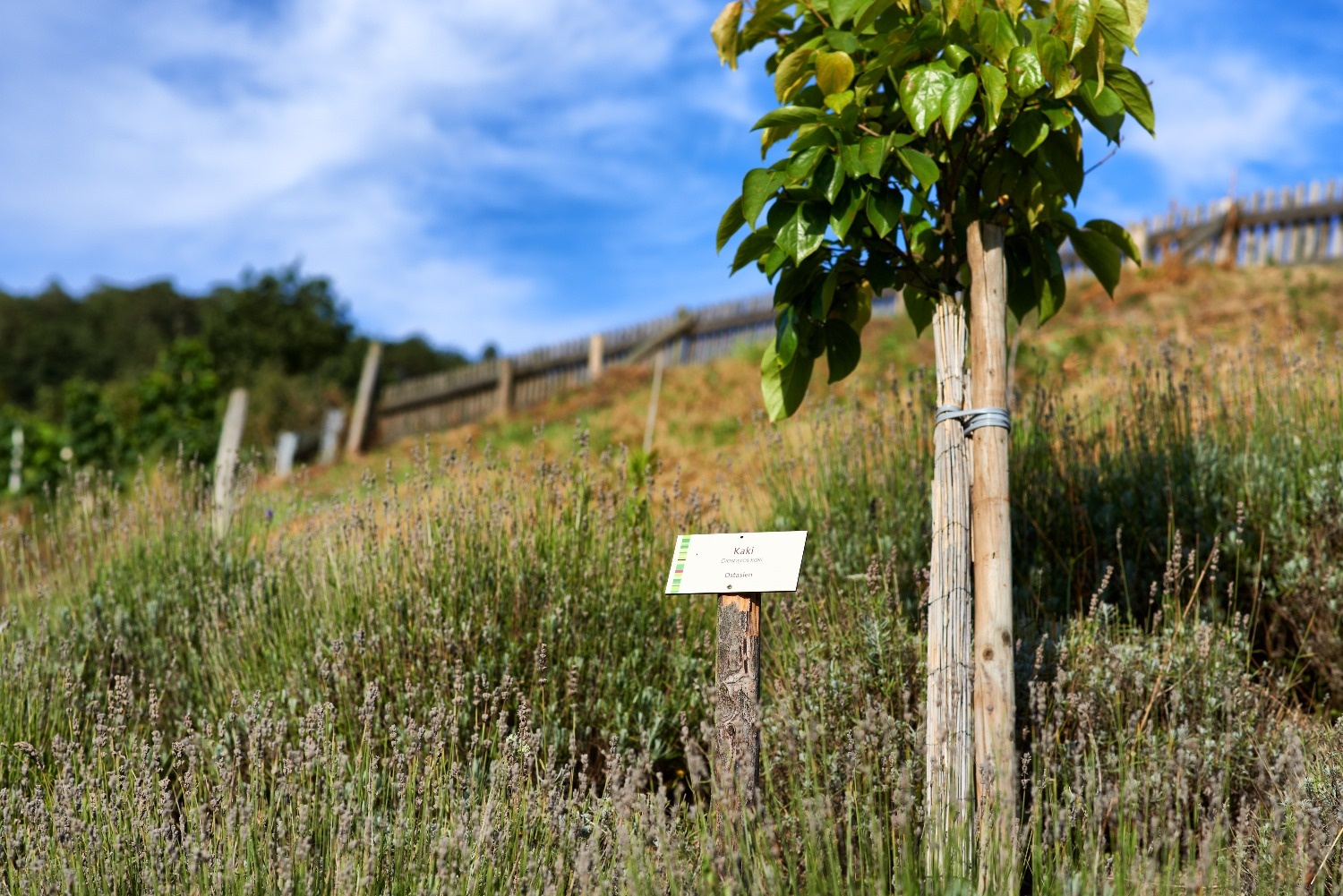 Im Sortengarten von Zeltingen-Rachtig wurden auf einer ehemaligen Rebfläche neben heimischen Sträuchern und Nutzgehölzen auch mediterrane und exotische Arten gepflanzt, um zu testen, ob sich diese etablieren und sich den klimatischen Bedingungen anpassen können.