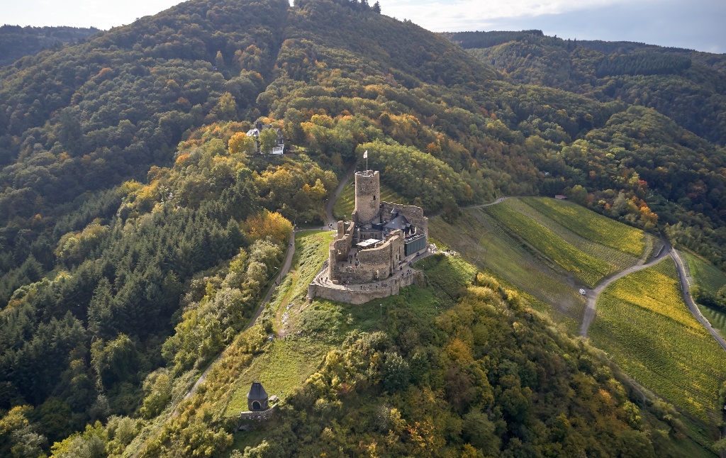 Mit dem Verlassen des Walds eröffnet sich Ihnen der Blick auf die Rebhänge des Wildbachtals und die Burgruine Grevenburg. Viele der Rebfluren, wurden auf Grund der schwierigen Bewirtschaftung in den letzten Jahren aufgegeben. Schnell stellte sich daraufhin eine Staudenflur mit Kanadischer Goldrute ein, welche mit ihren Blüten die Hänge im Spätsommer in ein kräftiges Gelb taucht. An einem steilen Kerbtälchen führt Sie der Weg entlang von Streuobstwiesen ins Tal nach Traben-Trarbach. Vorbei am 1898/99 erbauten Brückentor erreichen Sie die Innenstadt von Traben-Trarbach. Wir empfehlen die Rückfahrt nach Bernkastel-Kues mit den Mosel-Schiffen.