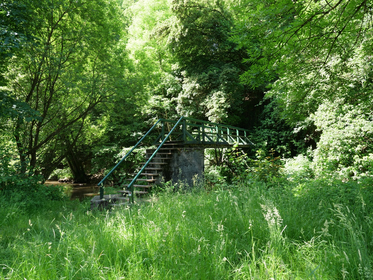 Parallel zum Wanderweg „Jufferweg“ führt Sie die Strecke in Richtung Osann-Monzel. Während der Jufferweg anschließend nach links ins Tal führt, verläuft der Zwei-Täler-Blick geradeaus zum „Weitblick“, auf Zalzert und anschließend an einigen an einigen Weingütern vorbei in Richtung Ortsmitte von Monzel. Weiter gehen Sie über die Brücke nach Osann. Gleich hinter der Brücke sollten Sie die Straßenseite wechseln, um einen kurzen Blick in das kleine Museum in der Moseltalstraße zu werfen. An der Osanner Kirche „St. Peter“ biegen Sie nach rechts in die Straße „Steinrausch“. Dann gehen Sie durch ein kleines Gässchen gleich wieder rechts ins Oestelbachtal hinein. An einem Obstbaumgarten führt Sie ein Wiesenweg direkt zum Oestelbach. Nach Überqueren der Holzbrücke treffen Sie auf das Erholungsgebiet mit einer Wassertretanlage von Osann-Monzel. Zwischen Kornfeldern und Weiden wandern Sie in Richtung Noviand. Sie überqueren die Kreisstraße und wandern Richtung Ortsmitte. Links biegen Sie in den Akazienweg ein und wieder geht es hinunter ins Bachtal. Danach gelangen Sie durch die Ortslage wieder zum Ausgangspunkt am Kloster Siebenborn zurück.