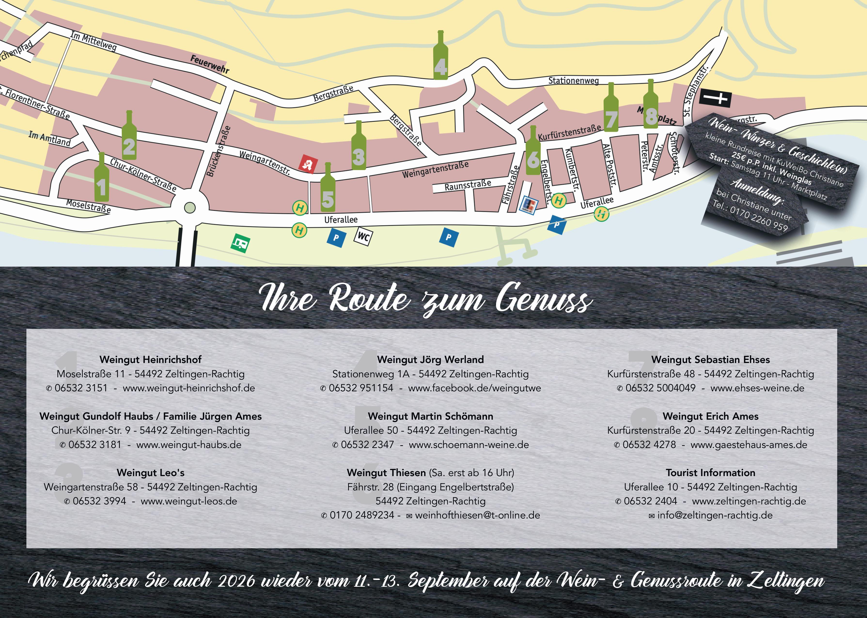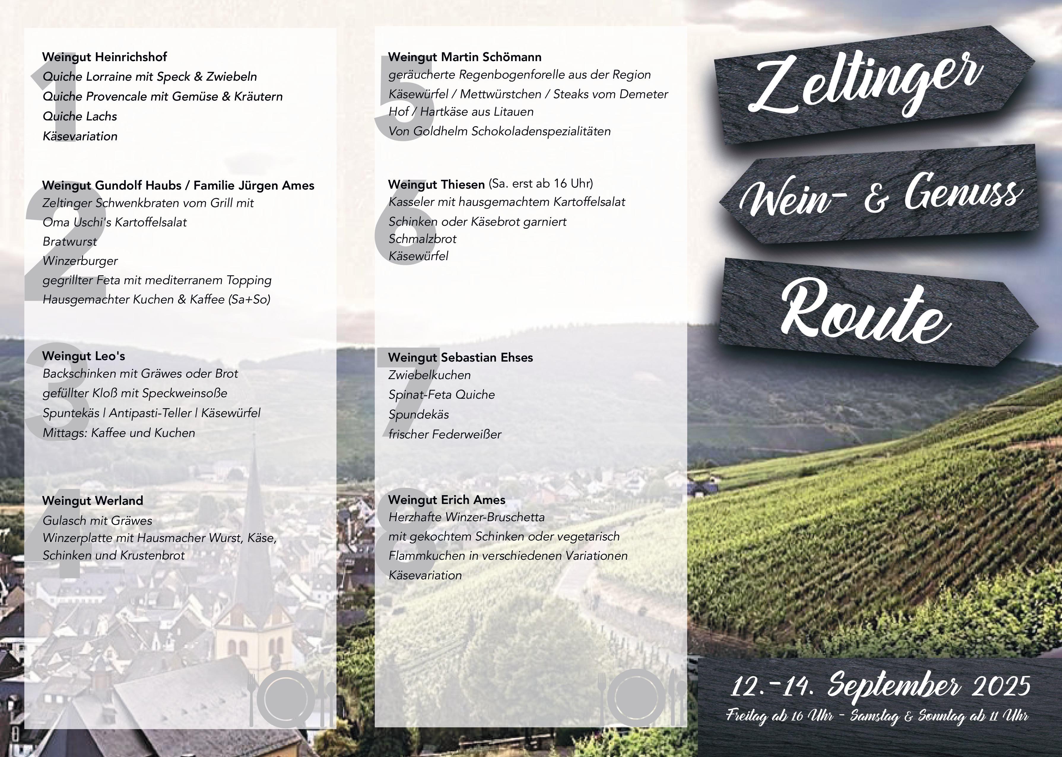 9 Weingüter und der Zeltinger Hof heißen alle Freunde des Zeltinger Straßenfestes, des Moselweins und der guten Küche im Mittelmoselort willkommen. Die herzliche Geselligkeit, die gute Probe im Weingut und ein glücklich gefüllter Magen werden auf dem neuen Fest im Vordergrund stehen. Die Winzer öffnen ihre Keller und Scheunen, um die Gäste auf neuen Plätzen bewirten zu können. Es wird durch den historischen Ortskern, die Zeltinger Straßen und die Weinberge geschlendert, um Winzer und Wirtsleute zu entdecken. Die Winzer- und Gastronomiefamilien haben sich einige Leckereien einfallen lassen und auch der vielversprechende 2024er Jahrgang wird den Gaumen erfreuen.