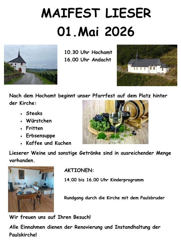 Alle Spenden und der Erlös des Maifestes kommen direkt unserer Paulskirche zugute. Nur so können wir unser Aushängeschild, die ein Teil unserer Identität ist, erhalten. Durch persönliche Gespräche wissen wir, wie wichtig die Paulskirche für uns und die Region ist. Die Viele Hochzeiten wurden dort gefeiert, die Messen bei Kerzenschein, sei es die Nikolausmesse oder die Messe am ersten Weihnachtsfeiertag, sind legendär und über die Grenzen unseres Heimatdorfes bekannt. Neu hinzugekommen ist die Traktorensegnung. Außerdem ist die Paulskirche ein beliebtes Wanderziel und man kann dort innehalten. Viele Vereine aus Lieser identifizieren sich mit dem Paulsbruder. Lassen Sie uns dies erhalten und behalten. Gemeinsam können wir dafür sorgen, dass wir weiterhin viele schöne Stunden in und an der Paulskirche verbringen können. Aus diesem Grund bedankt sich das katholische Gemeindeteam Peter und Paul sowie der Förderverein Paulskirche Lieser bereits jetzt für die Hilfe und die Spendenbereitschaft!