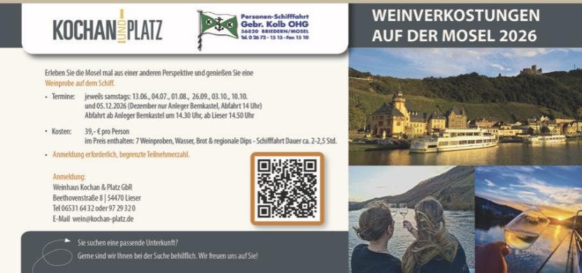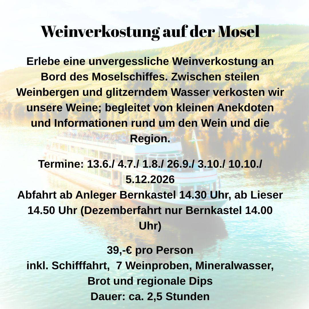 Entdecke eine unvergessliche Weinverkostung an Bord eines Moselschiffes. Zwischen steilen Weinbergen und glitzerndem Wasser verkosten wir unsere Weine. Begleitet von kleinen Anekdoten und Informationen rund um den Wein und die Region, wird es ein toller Nachmittag werden.