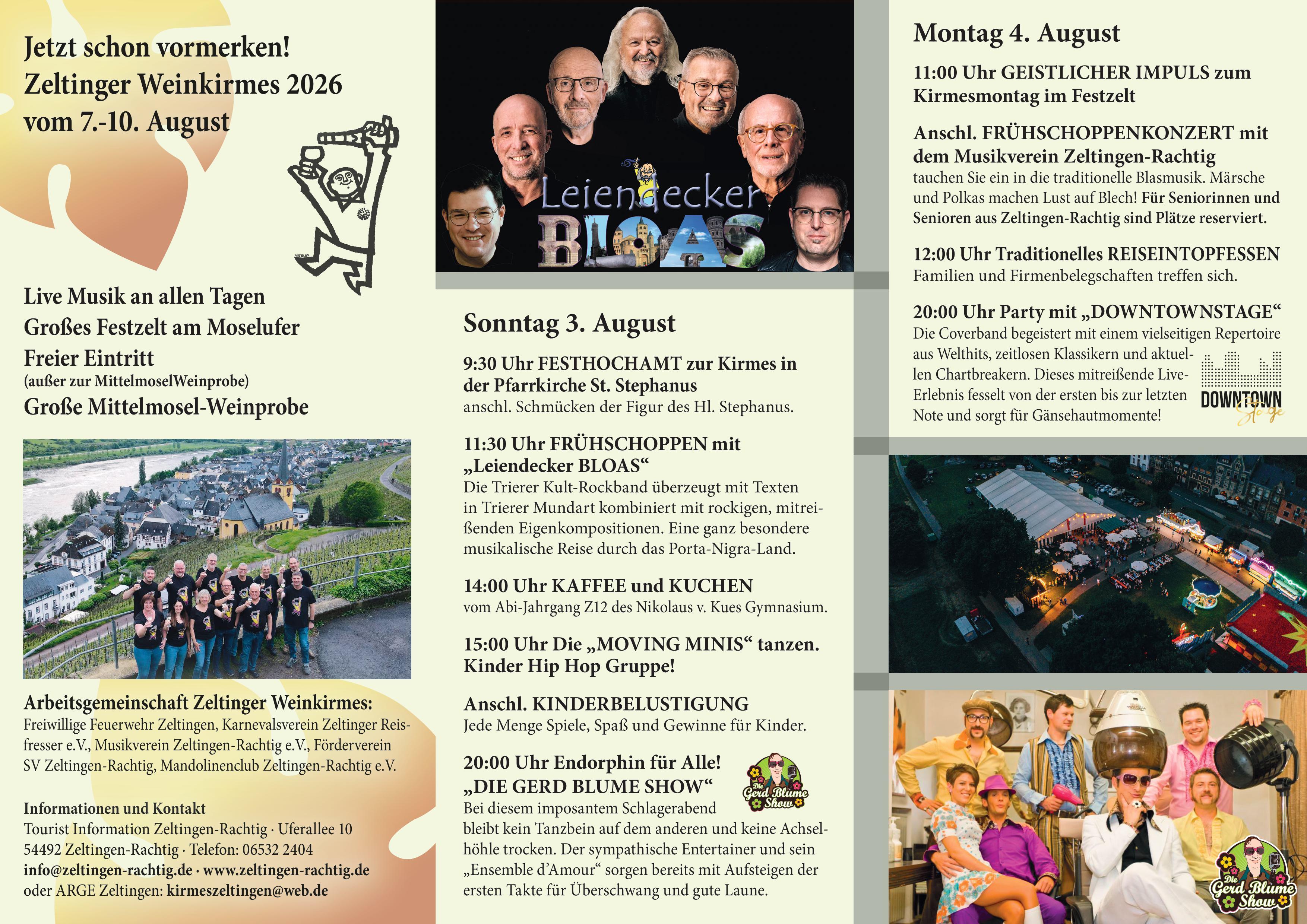Die traditionelle Kirmes findet jedes Jahr Anfang August statt. Am Samstag Nachmittag ist die große Mittelmosel-Riesling-Weinprobe mit Weinen aus Zeltingen-Rachtig und einigen Nachbargemeinden. Für das leibliche Wohl ist bestens gesorgt. Live-Musik an allen Abenden. Eintritt frei (außer zur Weinprobe).