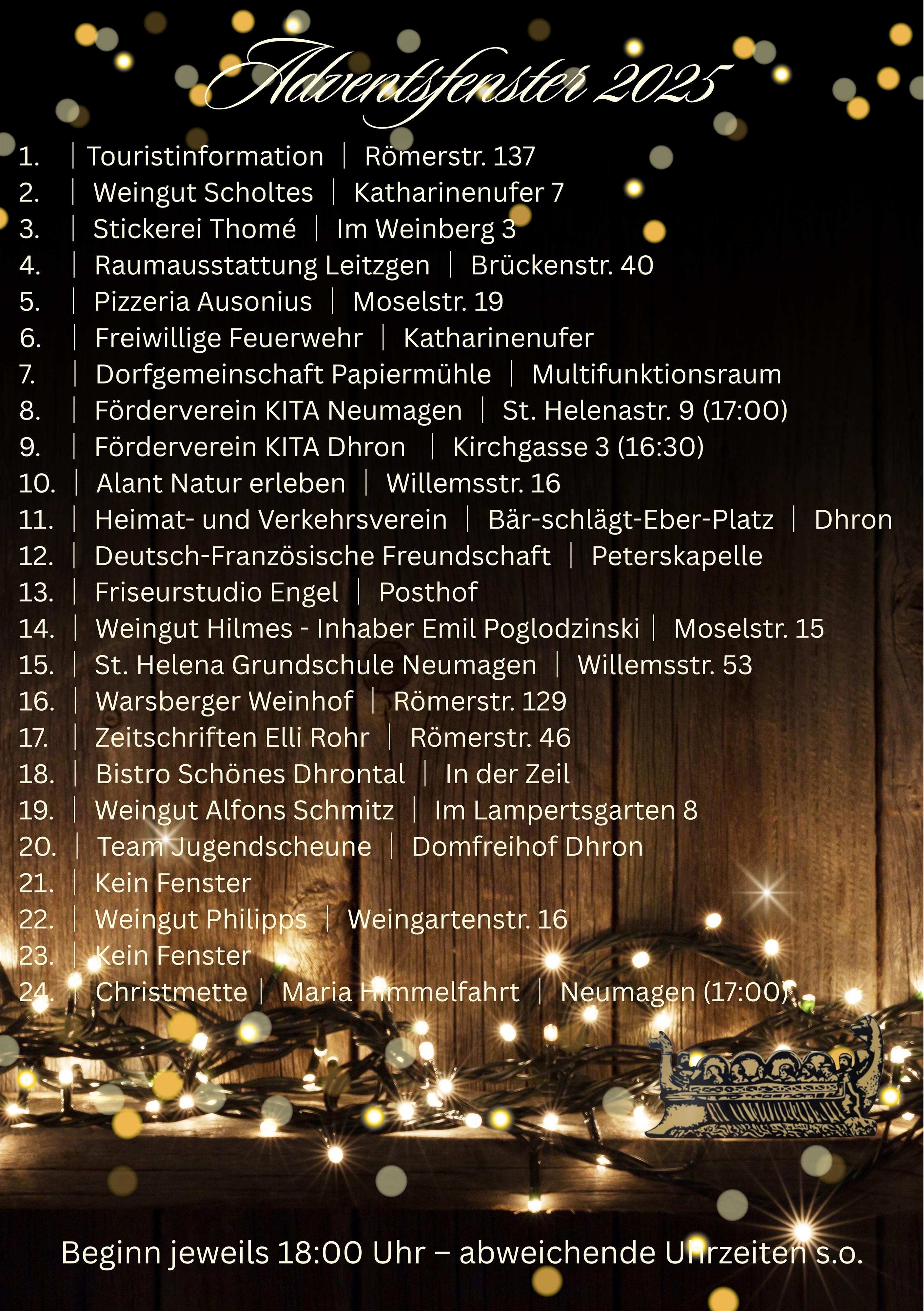 ✨ Adventsfenster 2025 ✨ Auch in diesem Jahr laden wir herzlich zu unseren Adventsfenstern ein. Jeden Abend um 18 Uhr öffnet sich ein neues Fenster – kommt vorbei, genießt die besondere Atmosphäre und startet gemütlich in die Adventszeit. Wir freuen uns auf euch! Den Flyer mit allen Terminen und Adressen erhaltet ihr in der Touristinformation