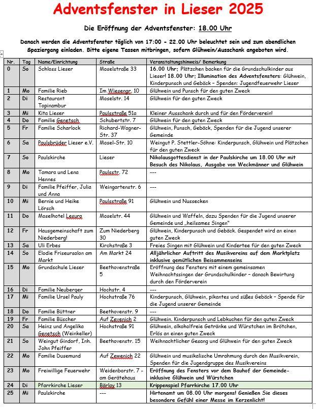 Im Advent planen wir, dass im Zeitraum vom 01.12.-24.12. wieder in 24 Lieserer Häusern Adventsfenster mit christlichen und weihnachtlichen Motiven zu sehen sind. Die Adventsfenster werden am Tag ihrer „Eröffnung“ um 18:00 Uhr eröffnet. Danach werden sie jeden Abend ab etwa 17:00 Uhr bis ca. 22:00 Uhr beleuchtet sein und zum abendlichen Spaziergang einladen. Jeden Tag im Dezember bis zum 24. Dezember wird ein weiteres Fenster leuchten. So wird es in Lieser täglich ein bisschen heller auf dem Weg zum Weihnachtsfest