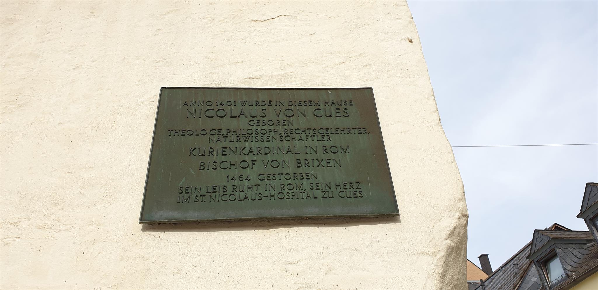 In diesem Hause hat er sein philosophisches Hauptwerk »De docta ignorantia« am 12. Februar 1440 vollendet, ein Werk, das wie ein Grenzstein zwischen Mittelalter und Neuzeit steht. Es löste die mittelalterliche Theologie und ihr geozentrisches Weltbild durch eine neue Deutung des Weltbaues ab. Diese ging sogar über Kopernikus, Galilei und Kepler hinaus und hat sich selbst im Licht der modernen Astrophysik eines Albert Einstein dem Grunde nach als wahr erwiesen.