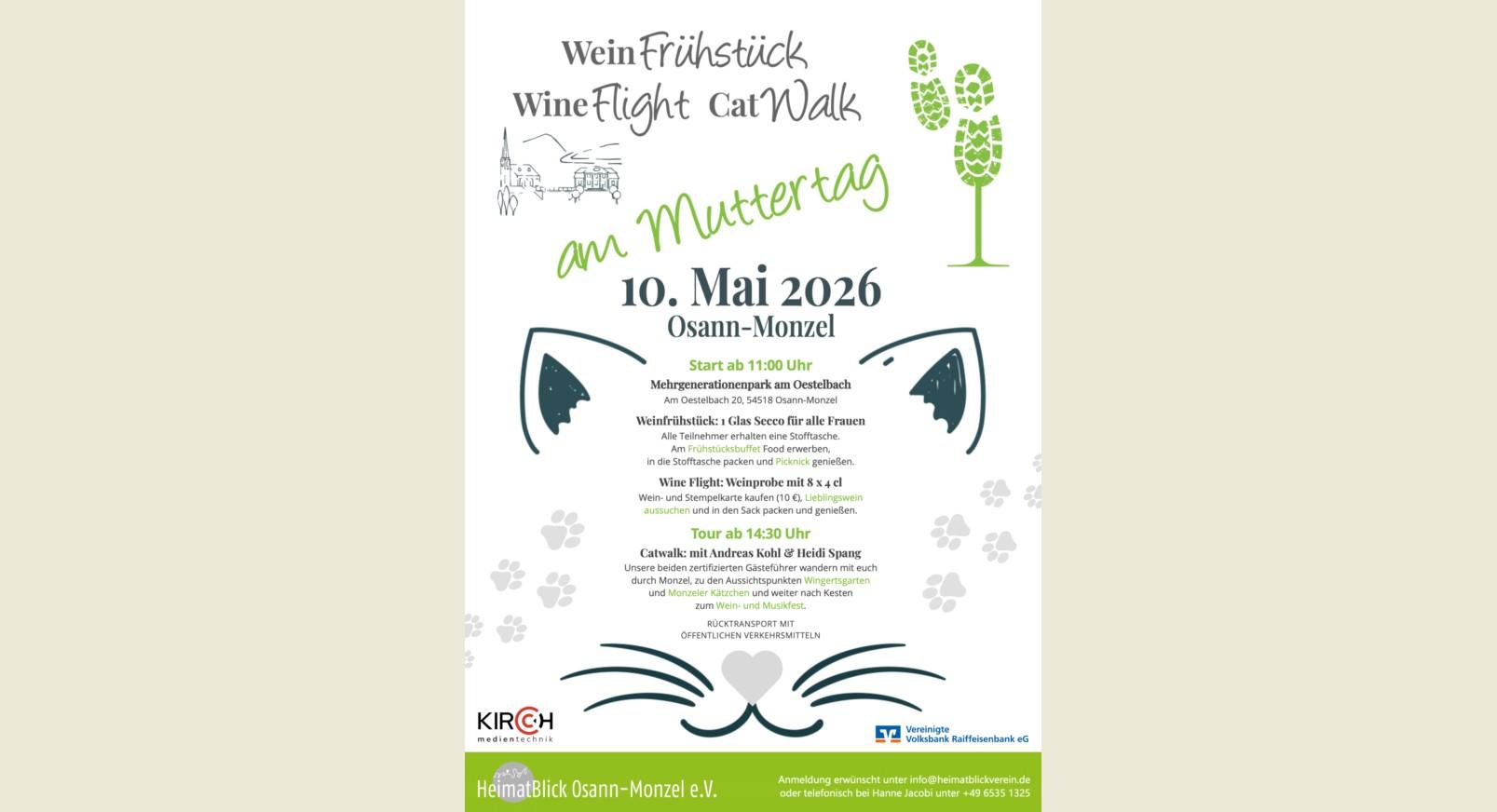 Tour ab 14:30 Uhr Catwalk mit Andreas Kohl & Heidi Spang Die beiden zertifizierten Gästeführer wandern mit den Teilnehmern durch Monzel, zu den Aussichtspunkten "Wingertsgarten" und "Monzeler Kätzchen", und weiter nach Kesten zum Wein- und Musikfest.